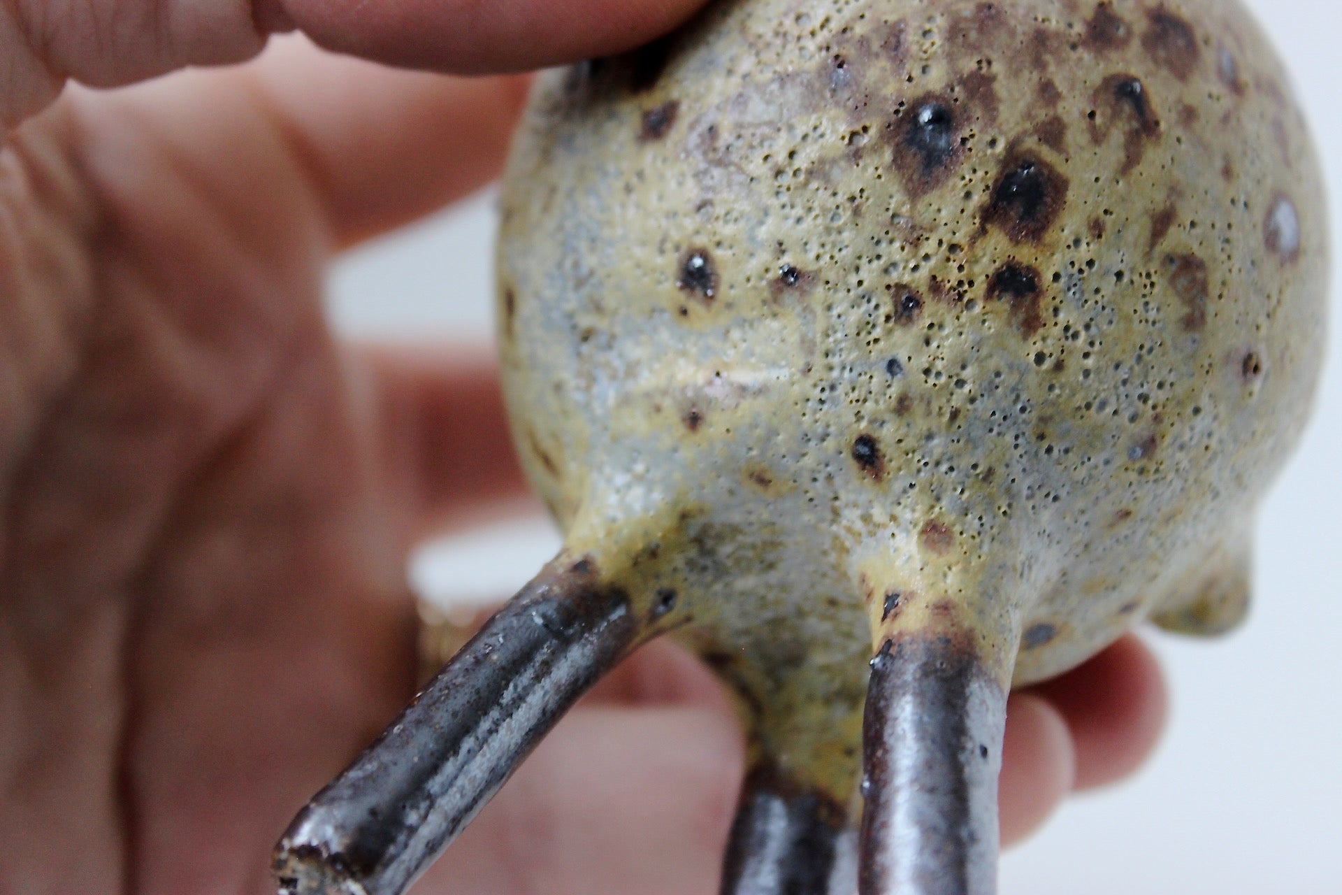 Construction: Hand built using coil and pinch technique with hand rolled legs.
