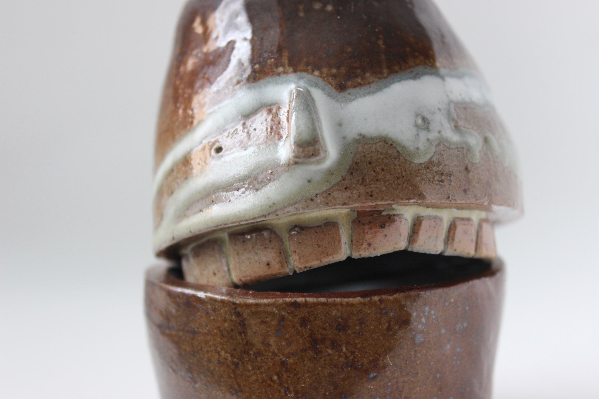 Construction: Hand built using slab technique. Teeth hand carved.