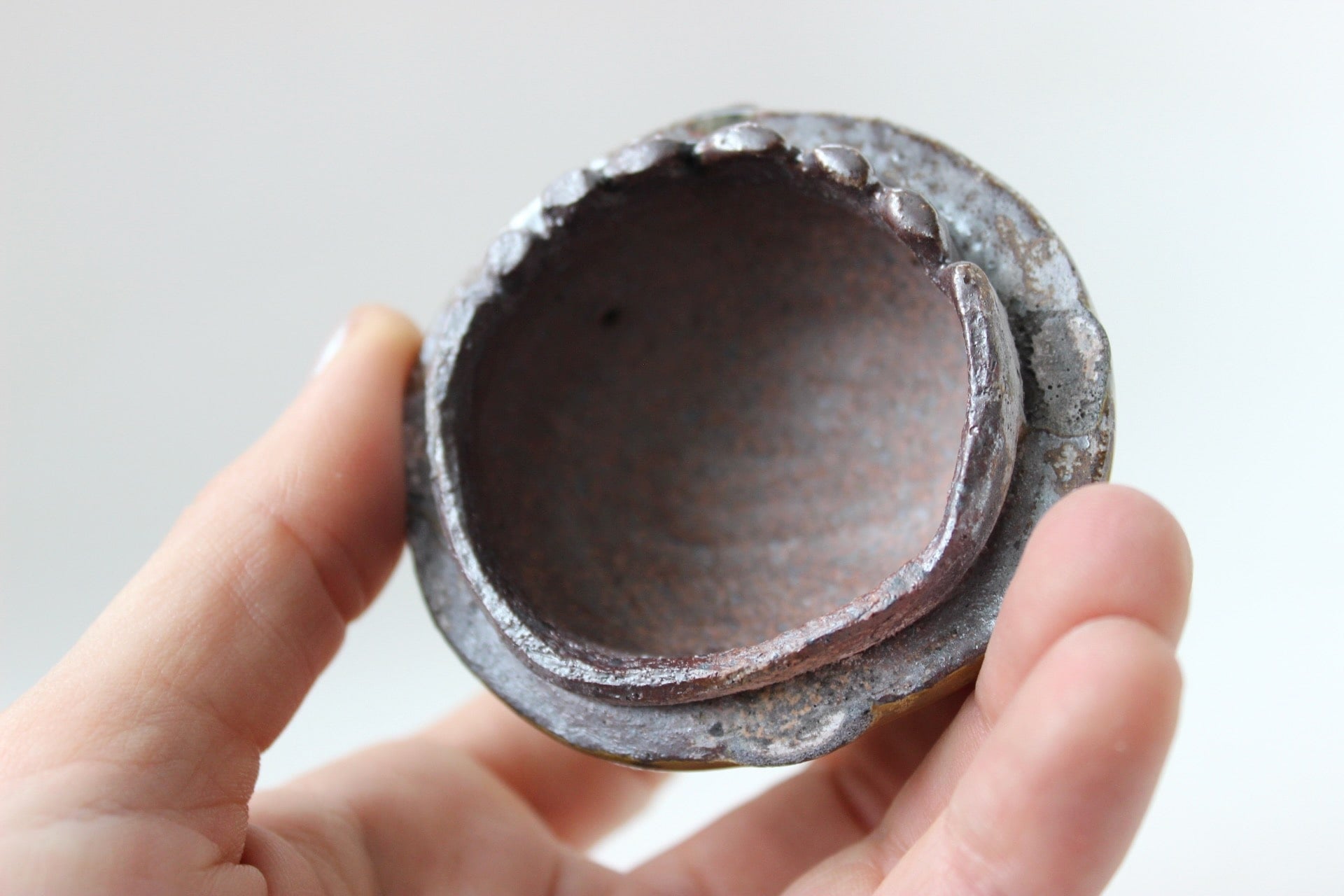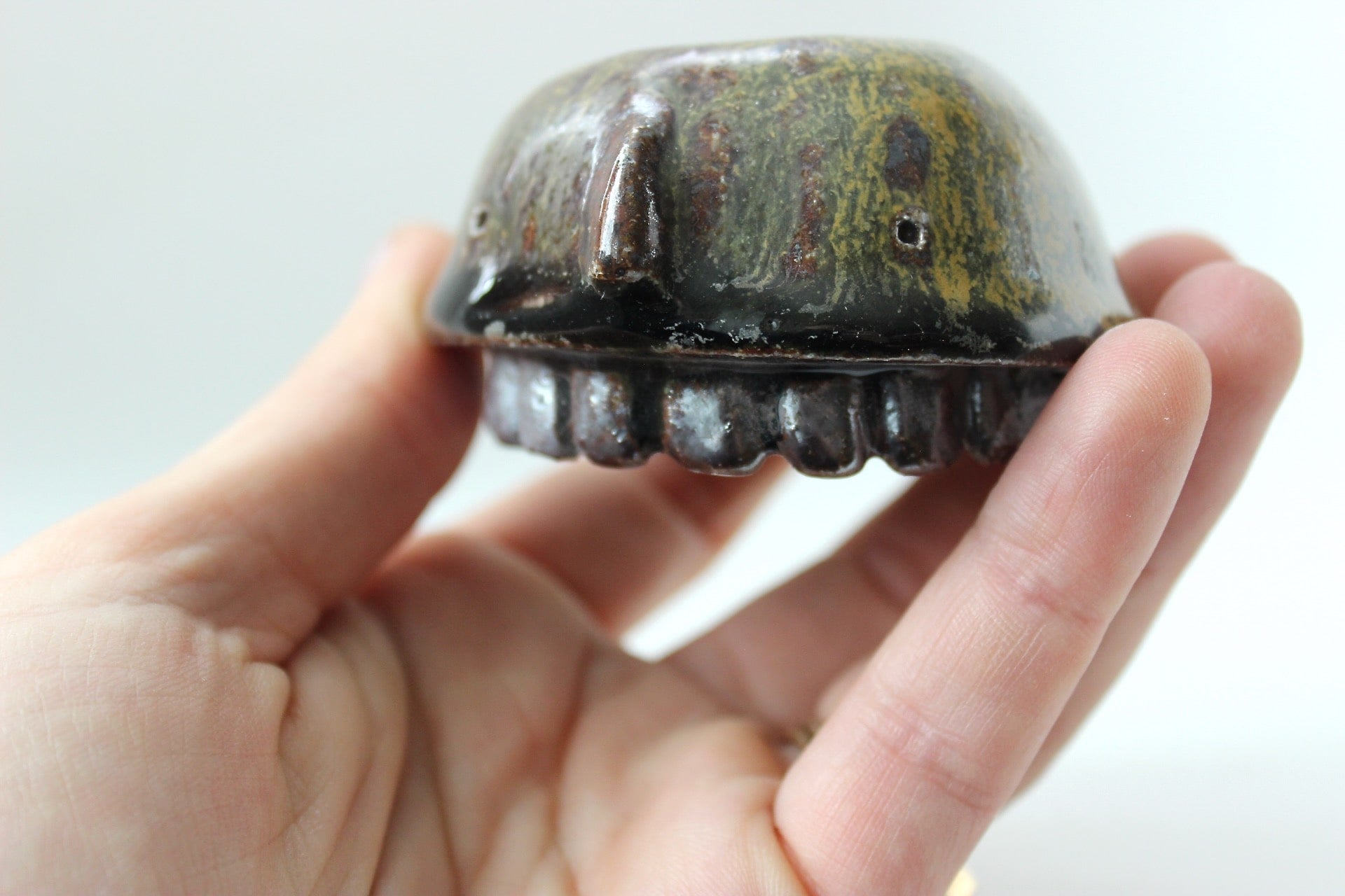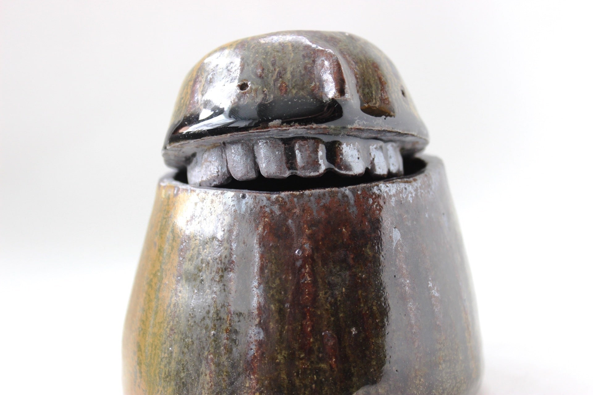Construction: Hand built using slab technique. Teeth hand carved at potter's peril.